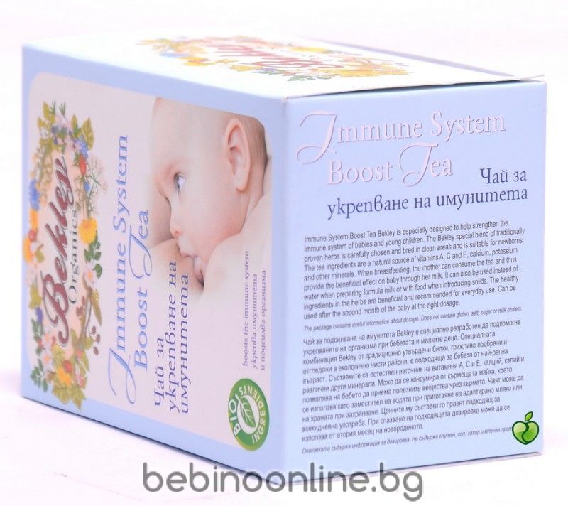 Bekley Чай за укрепване на имунитета е предназначен да подпомогне защитните сили на организма при бебета и малки деца. Специалната комбинация от традиционно утвърдени билки са отгледани в екологично чисти райони и са естествен източник на витамин А, С, и Е, калций и калий. В случай че бебето е кърмено, чаят е изключително подходящ за прием посредством майчината кърма. Bekley Чай за укрепване на имунитета може да бъде използван вместо вода при приготвяне на адаптирано мляко или при приготвянето на храната по време на периода на захранването.