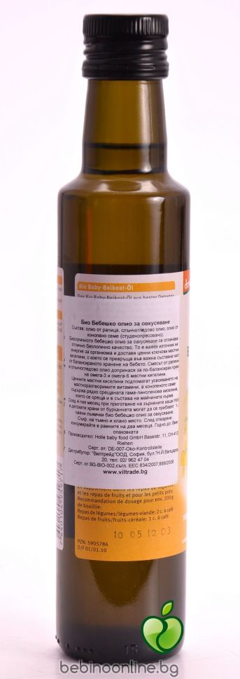 Био Бебешко олио за овкусяване след 4 мес. Добавя се при приготвянето на зърнени каши или към готовите пюрета за да добавите към храната на бебето ценните омега-3 и омега-6 мастни киселини. Конопеното семе, което е част от микса на бебешкото олио, съдържа и рядко срещаната гама-линоленова киселина, която се намира и в състава на майчината кърма.