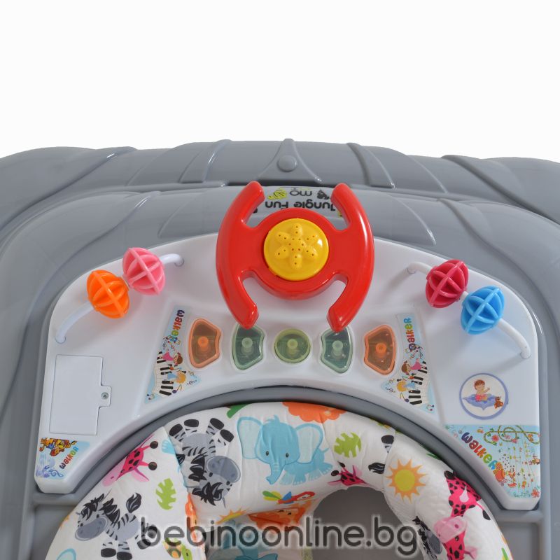 Описание на продукта:Проходилката Jungle fun е чудесен избор за деца на възраст от 6 месеца до достигането им на максимално тегло от 12 кг. Моделът ще задържи вниманието на детето, докато се учи да ходи, със своя интересен дизайн, 3 играчки и 5 бутона с мелодии със светлинна индикация. Нивото на височината се регулира в 3 позиции. Меката седалка и високата облегалка осигуряват комфорт и сигурност. Проходилката е с 8 колелца и 8 стопера за надеждност и безопасност. Когато не се използва, може да се сгъне до компактни размери.