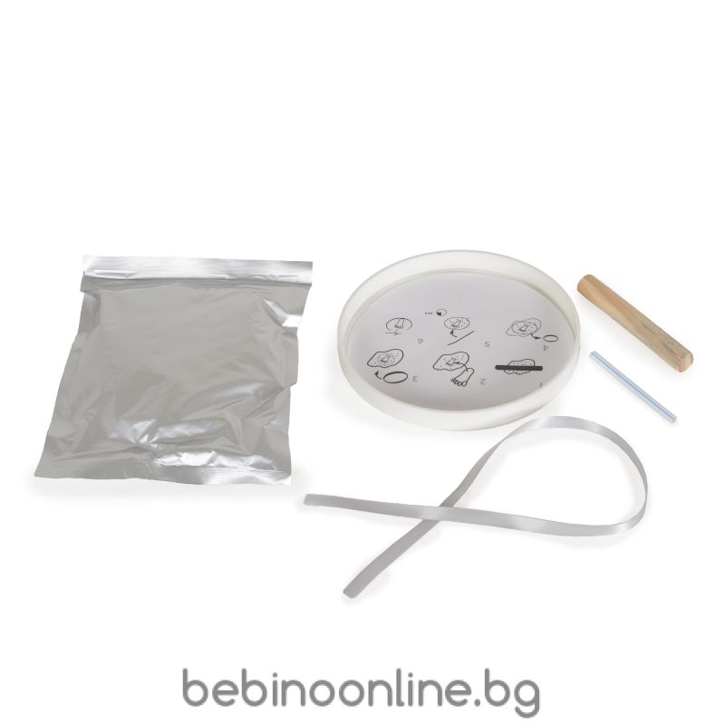 Комплектът съдържа: - материал за отпечатъка - панделка с дължина 50см - кръгла форма с диаметър 16см - сламка - дървен валяк - инструкция за употреба