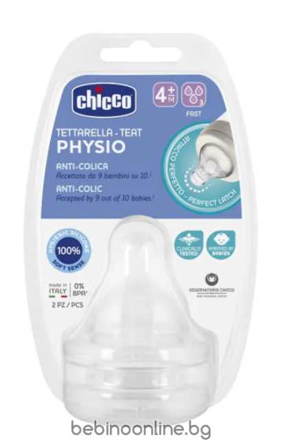 Описание : Силиконовият биберон Physio на Chicco се адаптира перфектно към устата на бебето и подпомага естественото сукателно движение. Симетричната, плоска и издължена форма на силиконовия биберон Chicco Physio улеснява приемането от бебето, благоприятствайки перисталтичното движение на езика по време на сукане. Изработен от изключително мек силикон с покритие Soft Sense, биберонът Chicco Physio симулира гърдите на майката, предлагайки на бебето комфортно усещане, което улеснява приемането. Бърз поток от три капка .  Предлага се в четири различни потока (бавен, среден, бърз, за гъсти течности