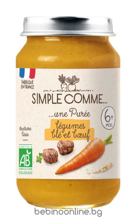 Хранителна стойност на 100g: Енергийност: 185kJ / 44kcal Мазнини: 0,6g от които наситени мастни киселини: 0,2g Въглехидрати: 5,8g от които захари: 2,3g Белтъчини: 2,9g Сол: 0,03g Фибри: 1,8g Натрий: 5mg Новата серия храни за бебета SIMPLE COMME, създадена от Babybio. Зеленчуково пюре с говеждо месо, пшеница и зеленчуци – точно както бихте го приготвили сами у дома – с чисти и здравословни съставки, без излишни добавки. С гладка текстура и естествен вкус. Приготвено на пара, без добавена сол, без млечни продукти.