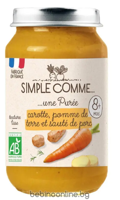 Хранителна стойност на 100g: Енергийност: 185kJ / 44kcal Мазнини: 1g от които наситени мастни киселини: 0,3g Въглехидрати: 5,8g от които захари:1,3g Белтъчини: 2,3g Сол: 0,05g Фибри: 1,3g Натрий: 11mg Новата серия храни за бебета SIMPLE COMME, създадена от Babybio. Зеленчуково пюре със свинско месо, моркови и картофи – точно както бихте го приготвили сами у дома – с чисти и здравословни съставки, без излишни добавки. С гладка текстура и естествен вкус. Приготвено на пара, без добавена сол, без млечни продукти и глутен.