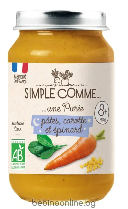 Хранителна стойност на 100g: Енергийност: 148kJ / 35kcal Мазнини: 0,5g от които наситени мастни киселини: 0,1g Въглехидрати: 6,9g от които захари: 1,4g Белтъчини: 1,2g Сол: 0,01g Фибри: 1,3g Натрий: 5mg Новата серия храни за бебета SIMPLE COMME, създадена от Babybio. Зеленчуково пюре от макарони,морков и спанак – точно както бихте го приготвили сами у дома – с чисти и здравословни съставки, без излишни добавки. С гладка текстура и естествен вкус. Приготвено на пара, без добавена сол, без млечни продукти.