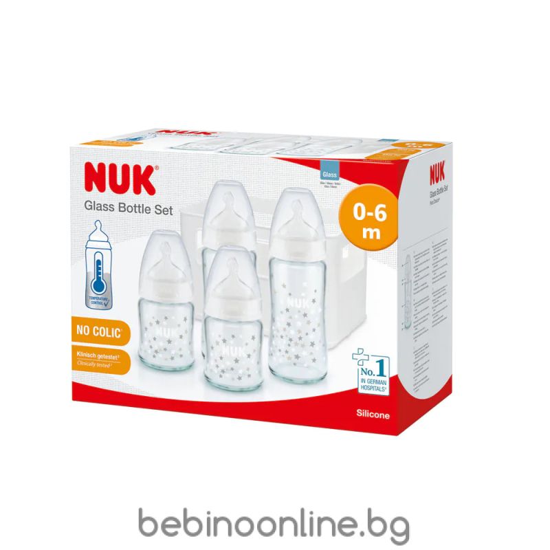 • Шишетата са със скала за контрол на температурата: - оцветена в бяло – горещо; - средно наситено синьо – 37 градуса; - тъмно синьо – студено; NUK бибероните са с ортодонтска форма – за успокояващо пиене, също както при кърменето. Новата мека зона допринася за по-добро адаптиране към устата на бебето. Продуктите NUK са произведени в съответствие със стандарт EN 14350.