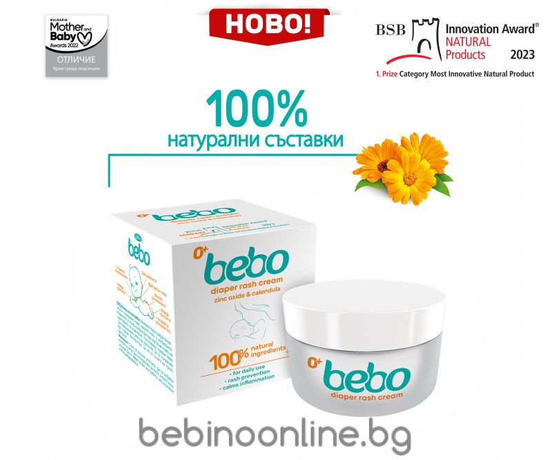 Начин на употреба:Винаги когато е възможно, сменяйте пелената веднага след изхождане на бебето. Отстранете замърсената пелена Почистете кожата под пелената с вода или влажни кърпички. Подсушете кожата добре с нежни потупващи движения без да триете. Изчакайте кожата да изсъхне напълно и нанесете тънък слой крем при подсичане. Натуралният крем bebo се топи при контакт с кожата и нанасянето е изключително лесно. Кремът се нанася в цялата зона на кожата под пелената – под пъпа, горната част на бедрата и дупето. Не пропускайте да нанесете крем и в кожните гънки в покритата от пелената област. Поставете пелената За да подпомогнете здравето на кожата в памперс зоната, оставяйте бебето без пелена колкото се може по-дълго.