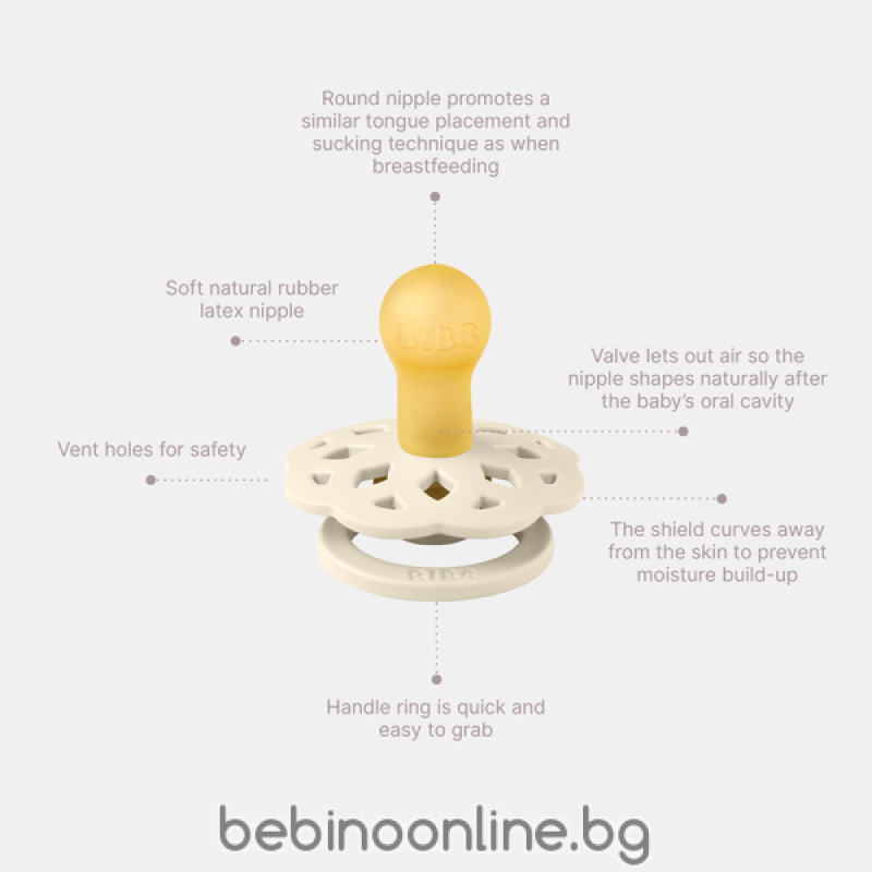 Начин на употреба: Биберонът трябва да бъде стерилизиран чрез поставяне в кипяща вода преди първата употреба. Тъй като той има вентилирано зърно, водата може да попадне в биберона. Когато биберонът се охлади, водата може да бъде изтласкана от зърното. Почиствайте и стерилизирайте ежедневно. Не използвайте микровълнова стерилизация или други агресивни почистващи препарати, тъй като това може да разруши естествения каучук. ВНИМАНИЕ! Винаги проверявайте продукта внимателно преди всяка употреба за безопасността на вашето бебе. Особено когато бебето има зъби. Издърпайте каучука във всички посоки. Изхвърлете го при първия признак на увреждане или слабост. Залъгалката не трябва да се оставя на пряка слънчева светлина. Нипелът е произведен от естествен каучуков латекс. Тъй като естественият каучуков латекс е естествен материал, може да възникнат промени в цвета.